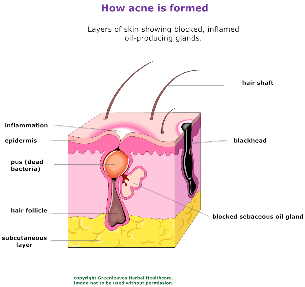 Layers of skin showing blocked, Inflamed, oil-producing glands: